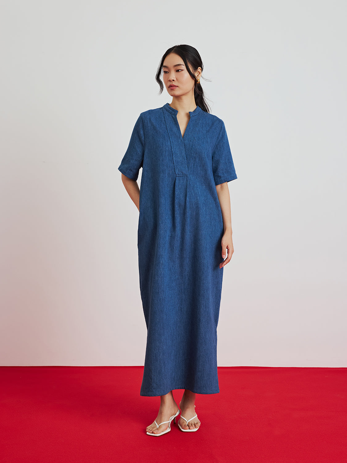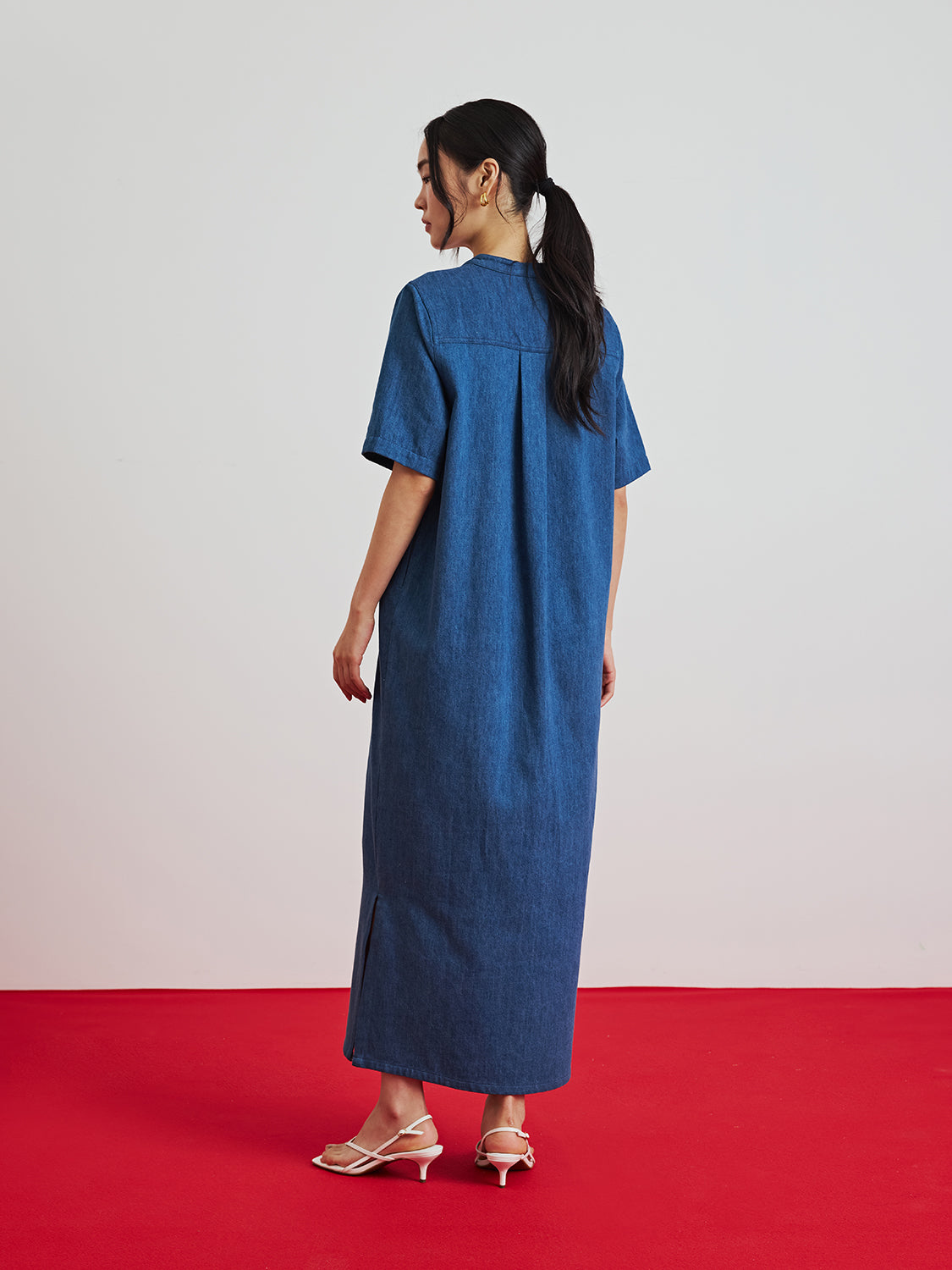 Denim Mandarin Collar Dress $125