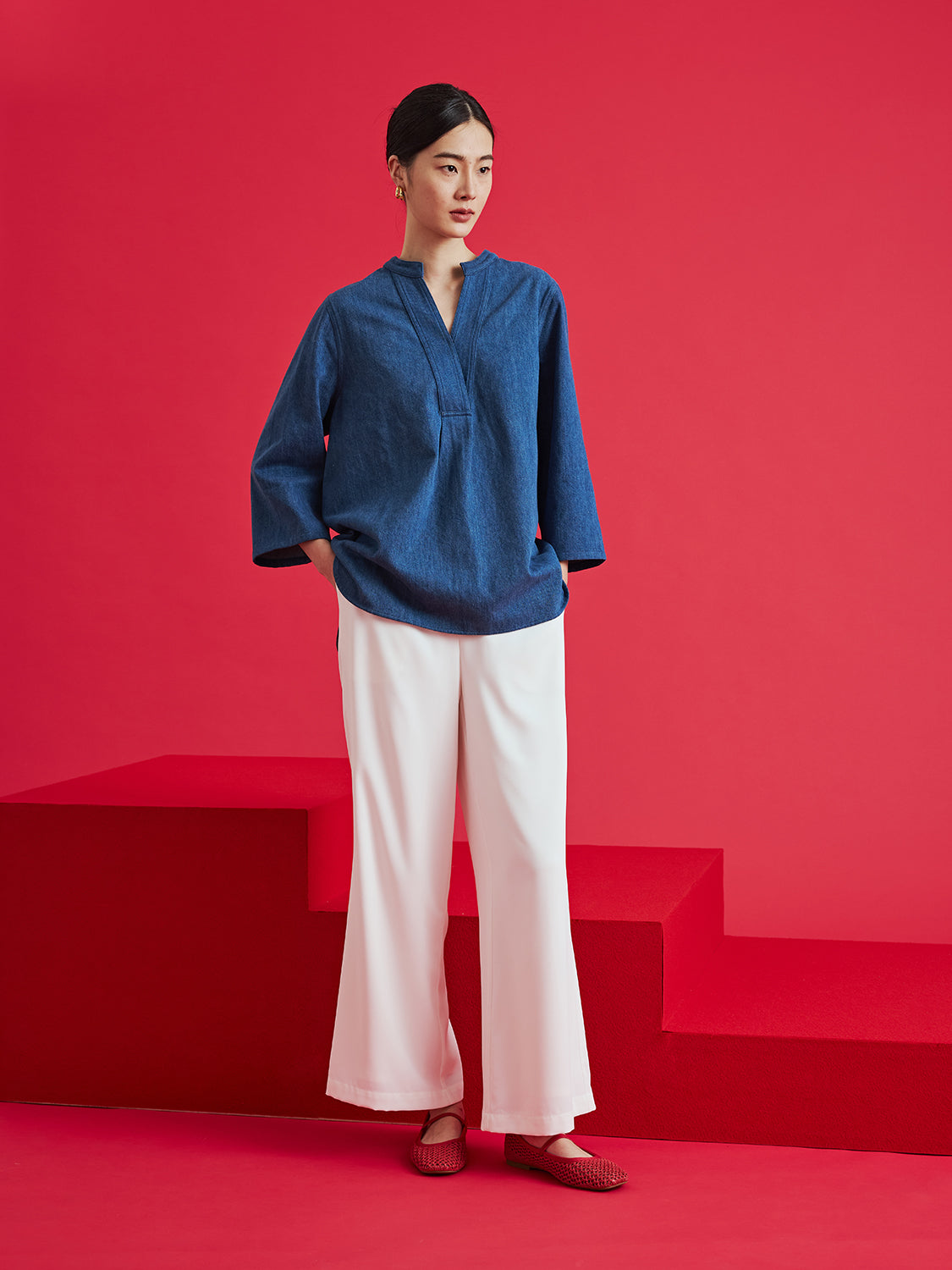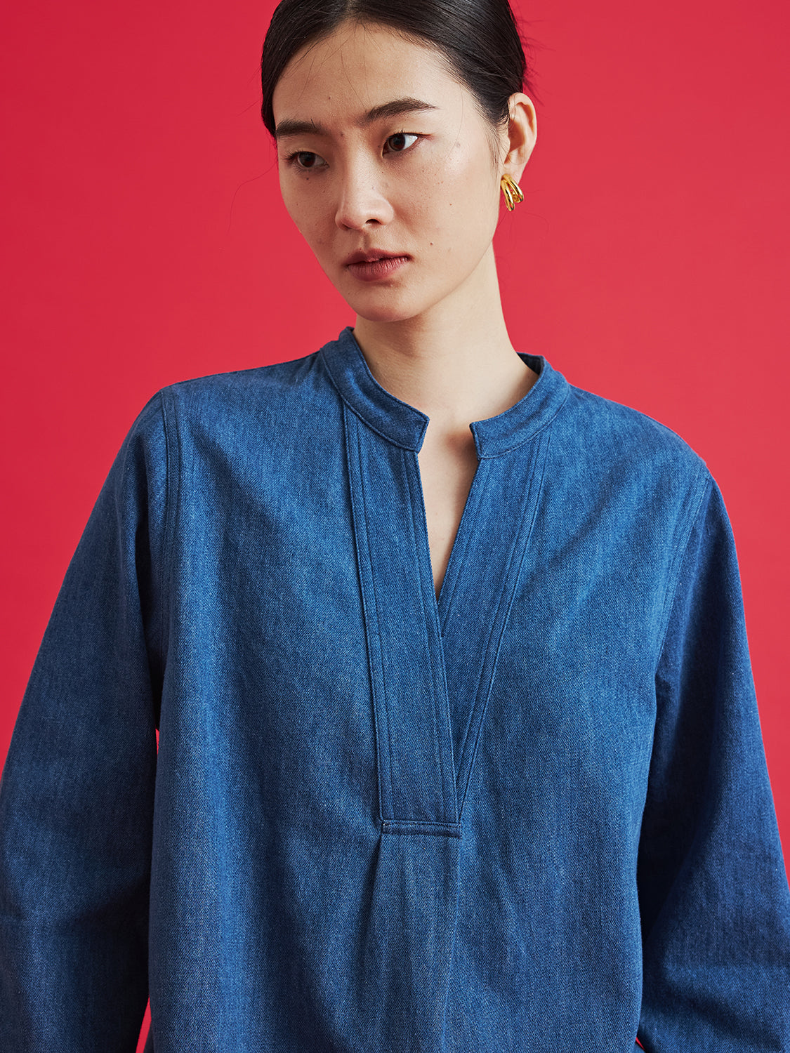 Denim Mandarin Collar Top $90