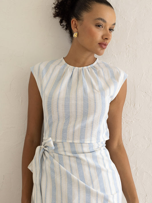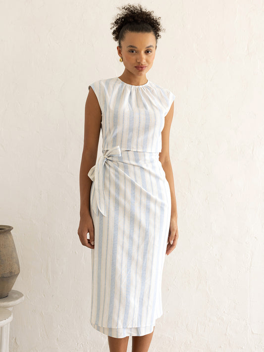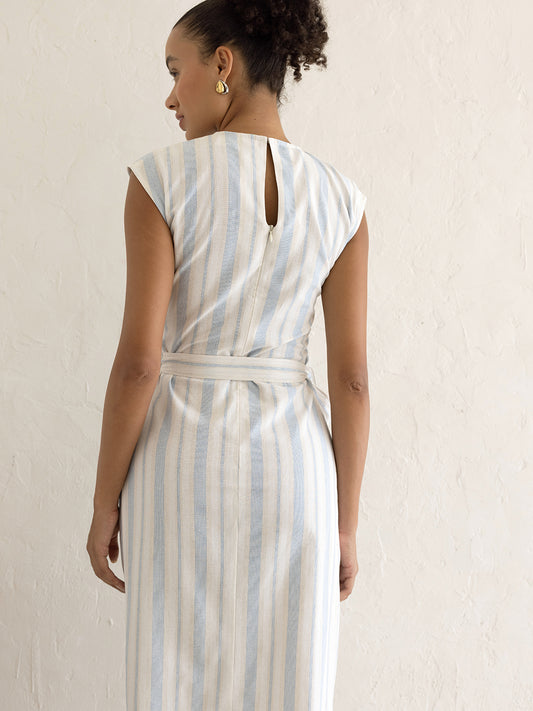 Mandarin V-Neck Kaftan Dress - Gardenia - Blue Yellow Stripe