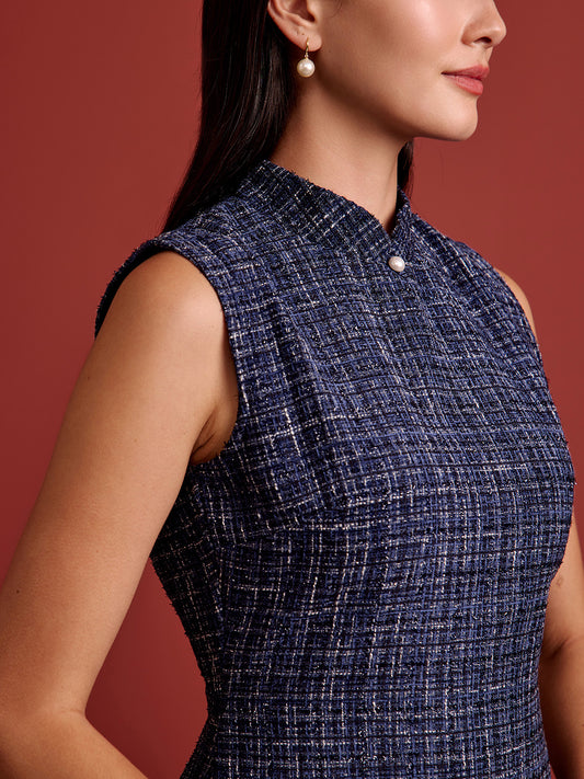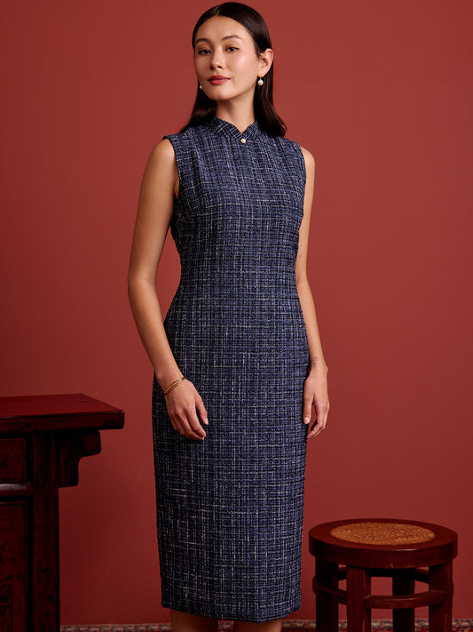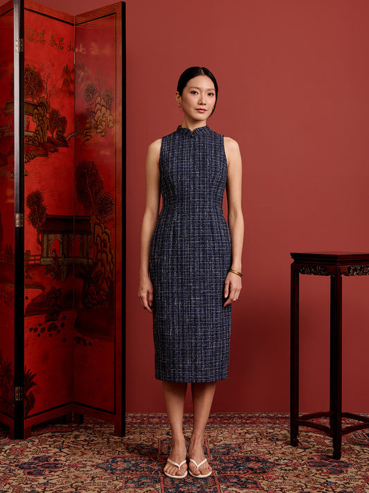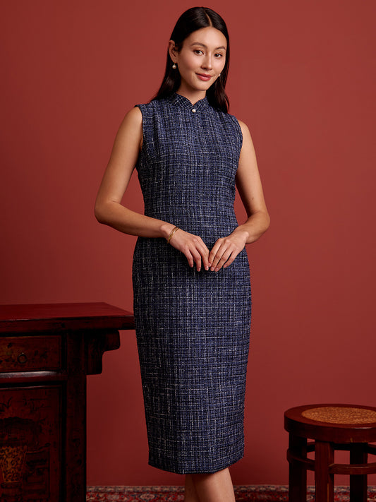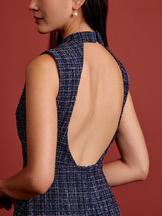 Padded Oval Open Back Cheongsam - Navy Tweed