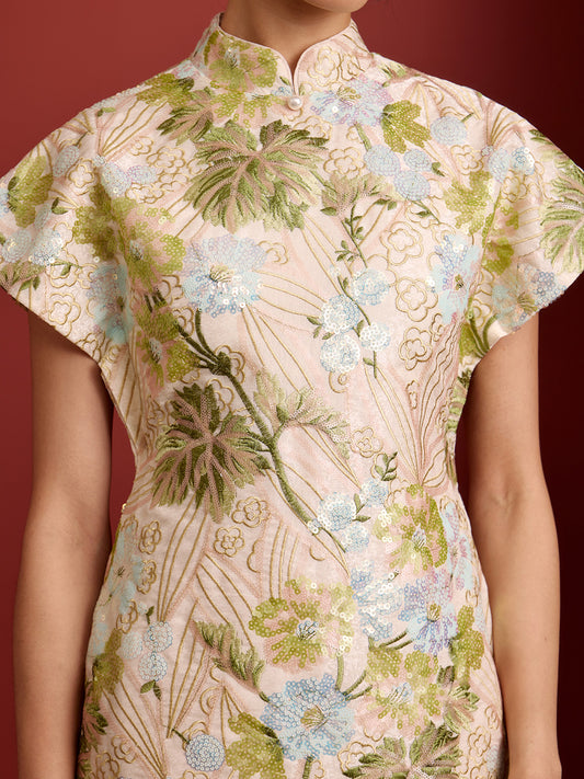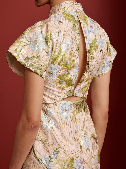 Padded Kaftan Open Back Cheongsam - Beaded Floral