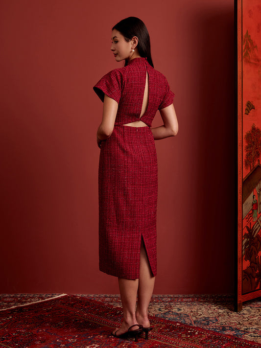 Padded Kaftan Open Back Cheongsam - Burgundy Tweed