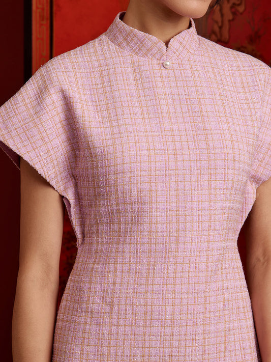 Padded Kaftan Open Back Cheongsam - Light Purple Tweed