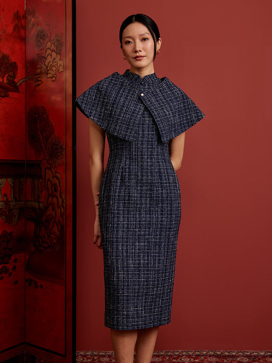 Multi-Way Cape Cheongsam - Navy Tweed