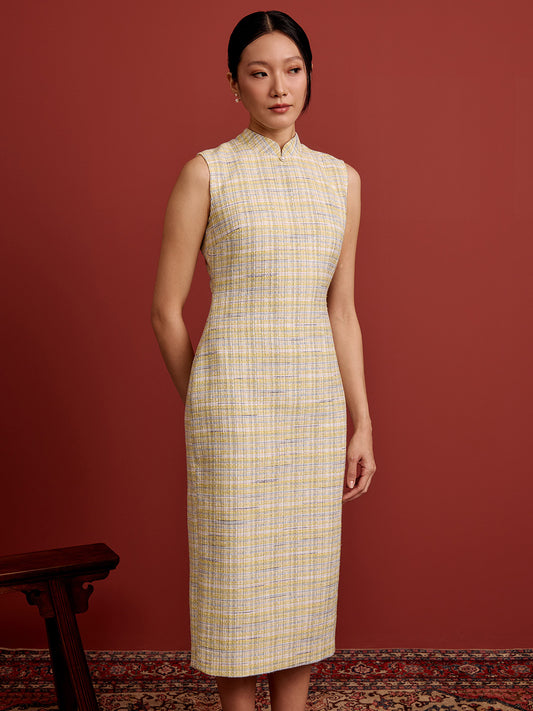 Padded Oval Open Back Cheongsam - Blue Yellow Check Tweed