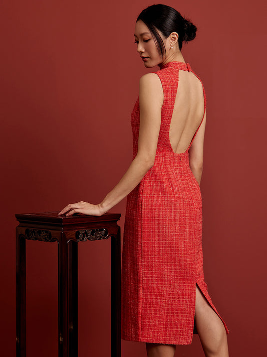Padded Oval Open Back Cheongsam - Orange Tweed