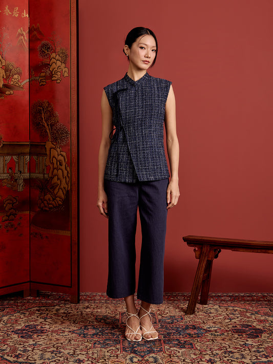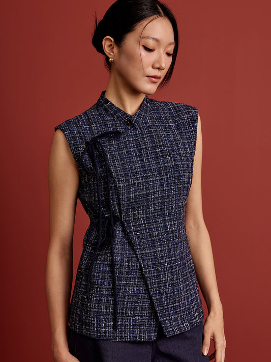 Mandarin Collar Ribbon Vest - Navy Tweed
