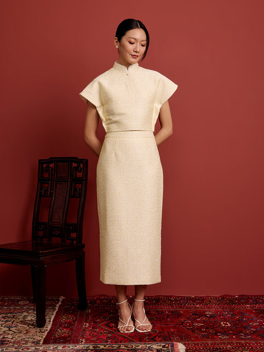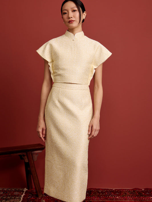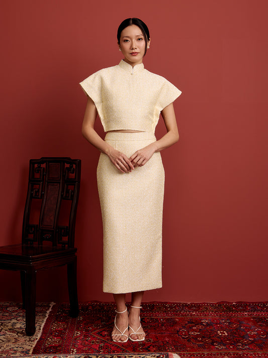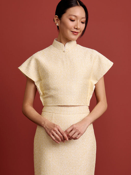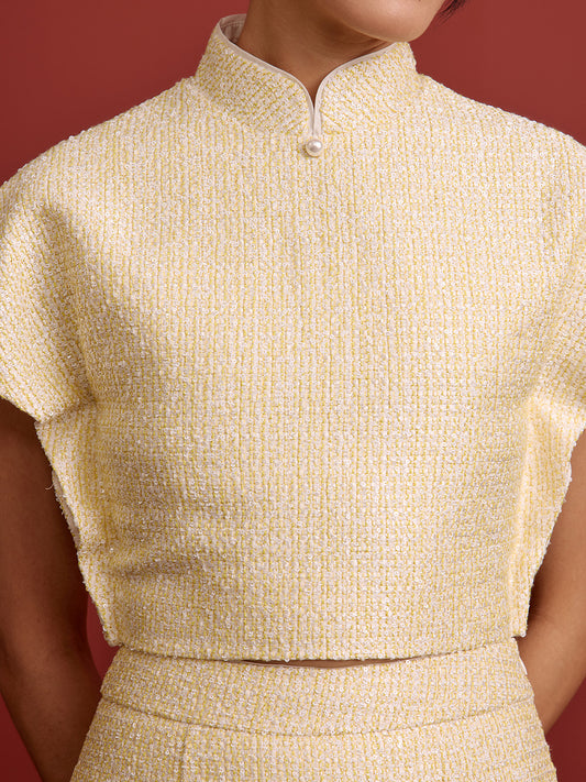 Padded Kaftan Sleeve Cropped Top - Beaded Light Yellow