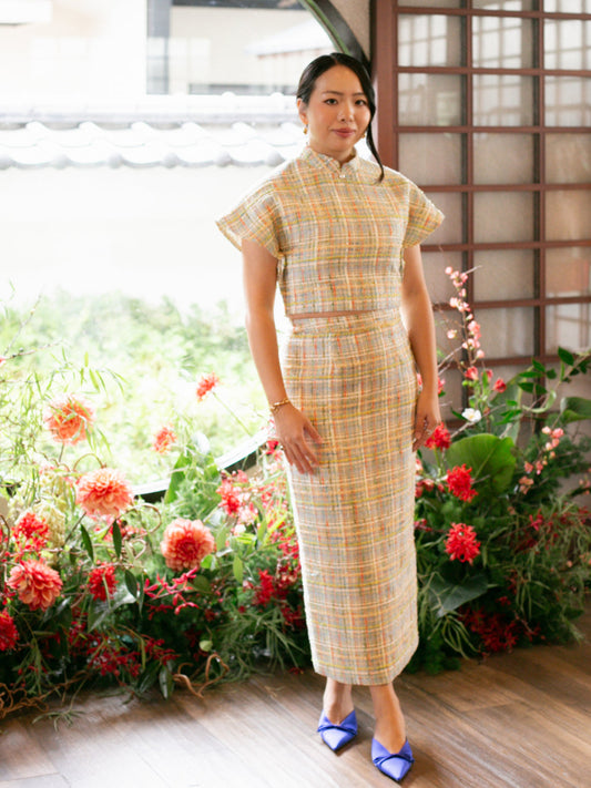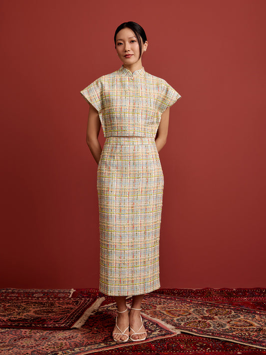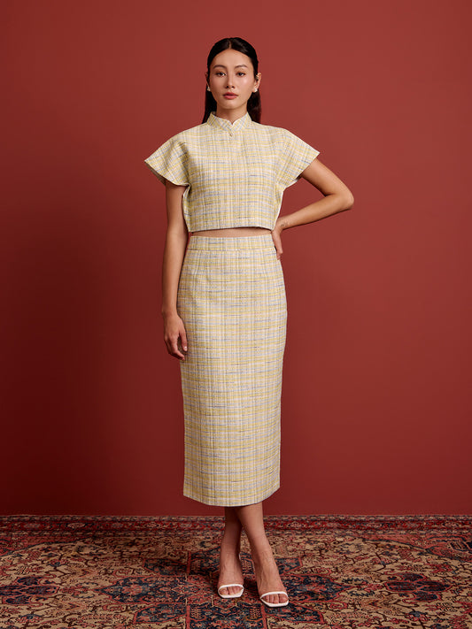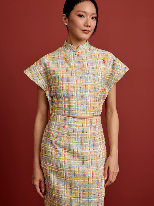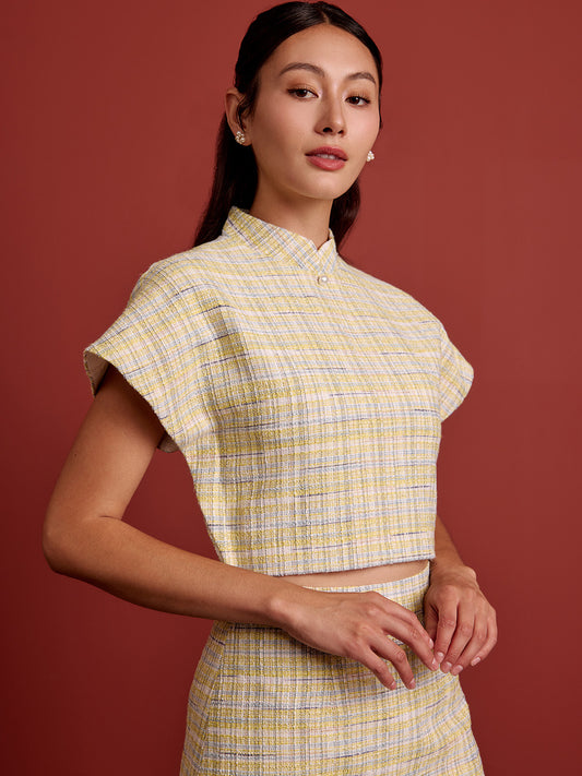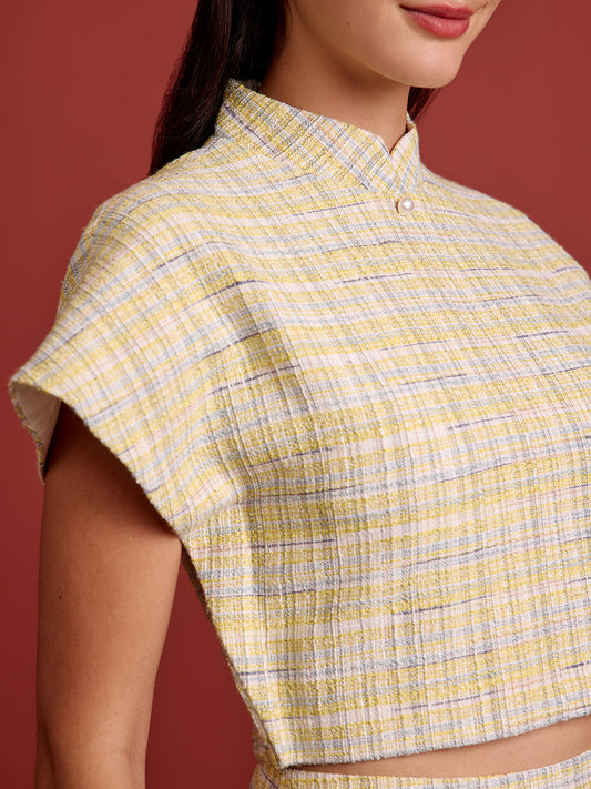 Padded Kaftan Sleeve Cropped Top - Blue Yellow Check Tweed