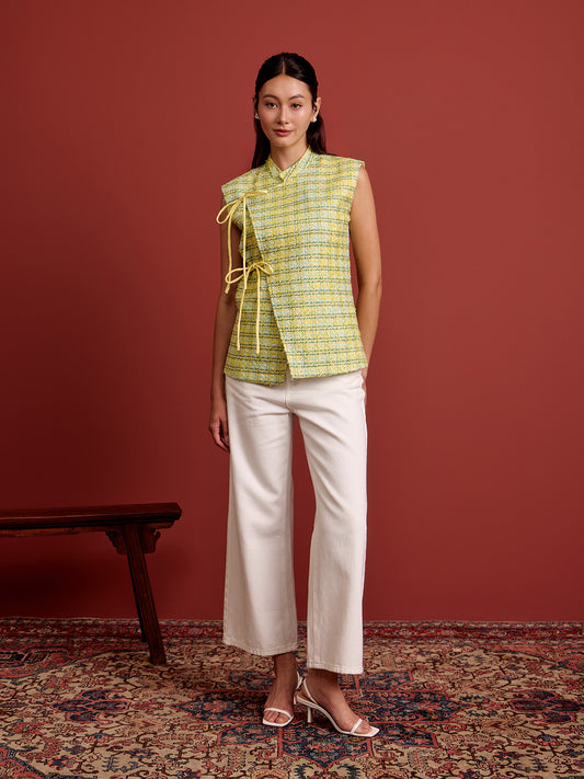 Mandarin Collar Ribbon Vest - Yellow Green Tweed