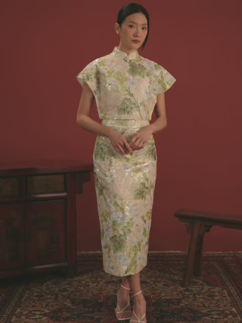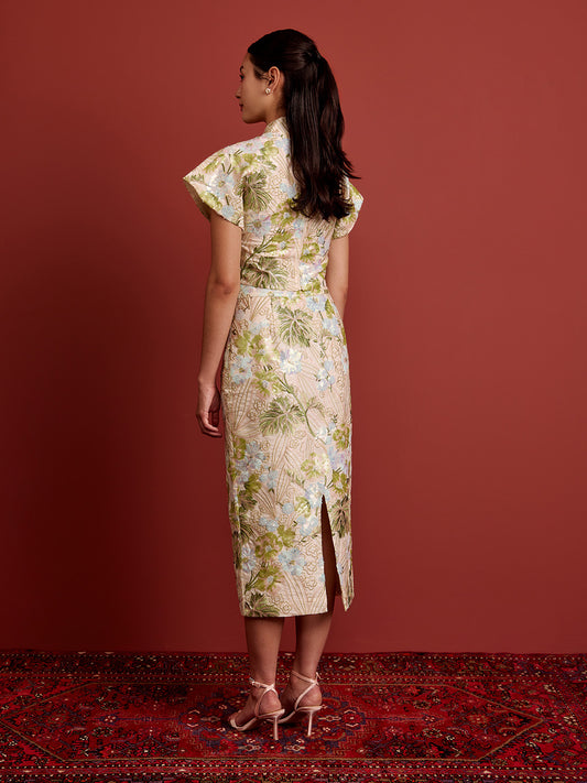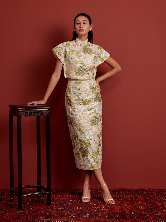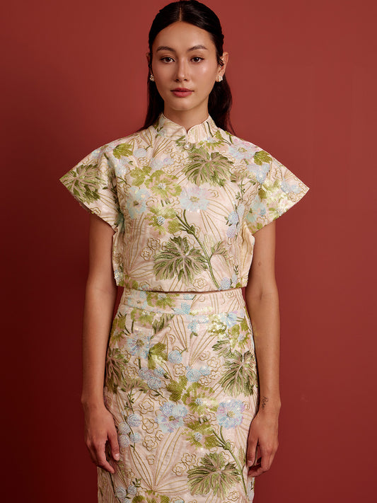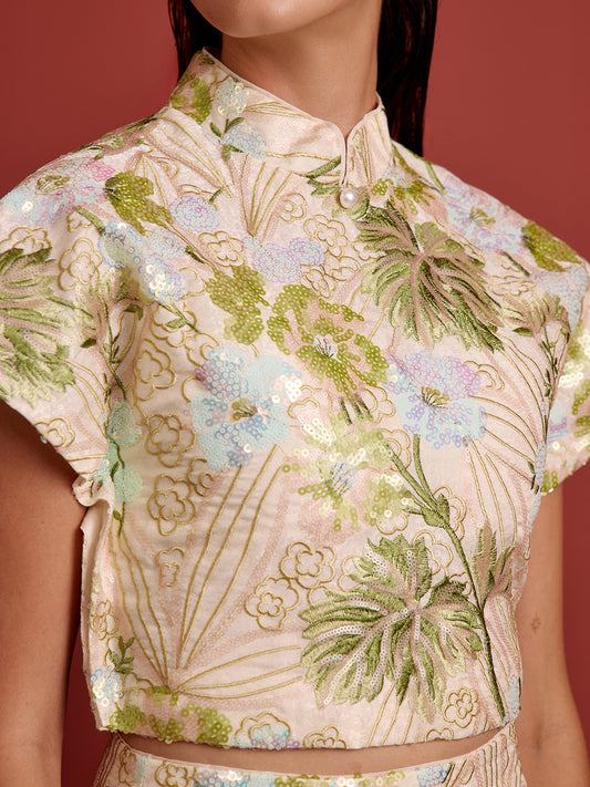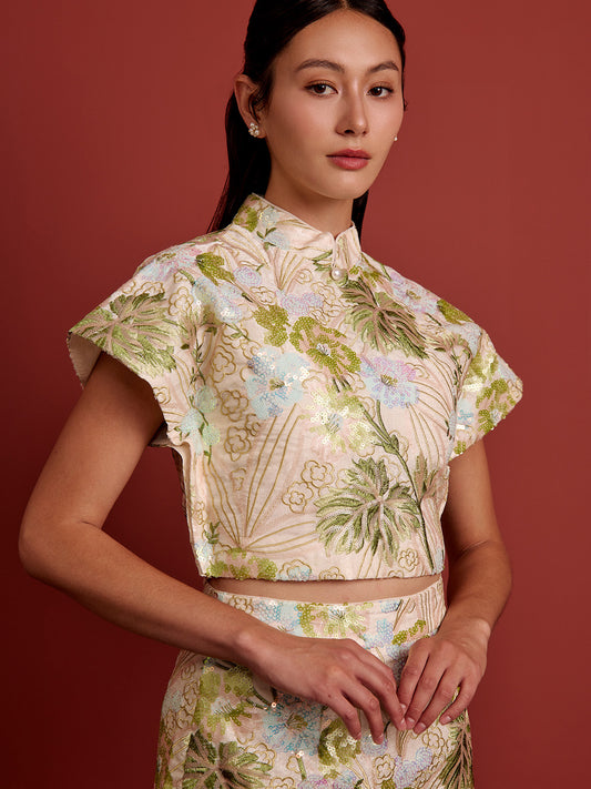 Padded Kaftan Sleeve Cropped Top - Beaded Floral
