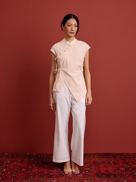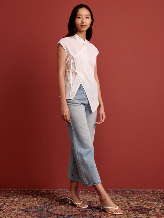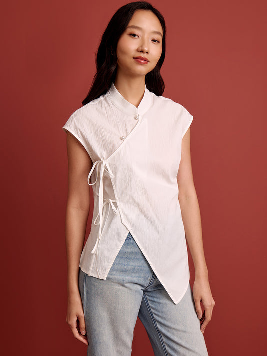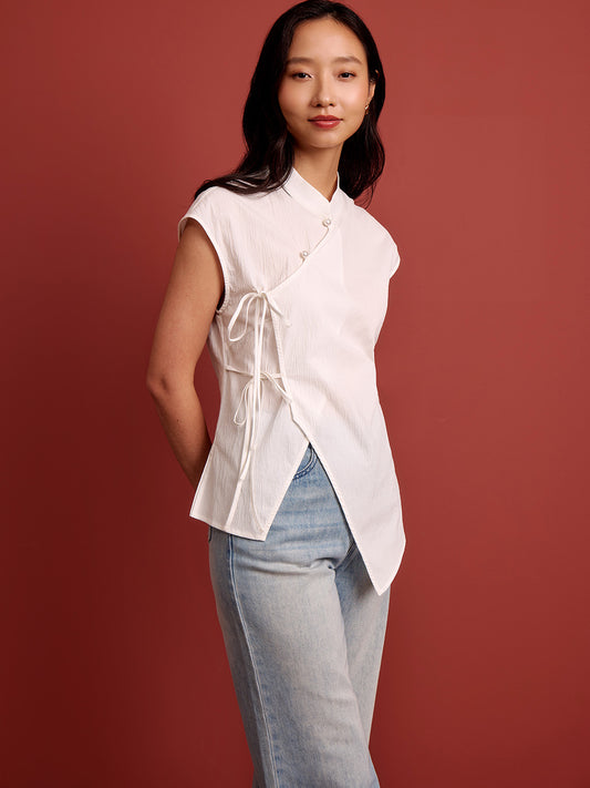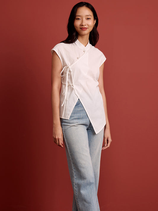Mandarin Collar Cross Ribbon Top - White Seersucker