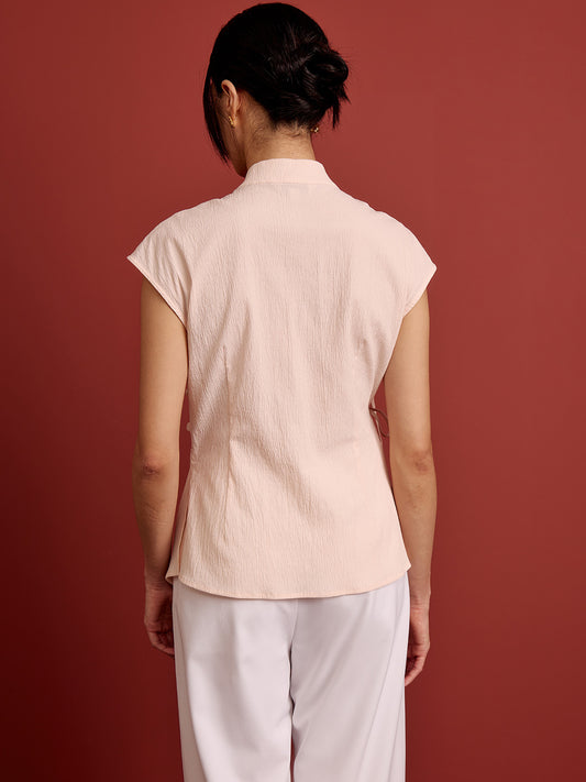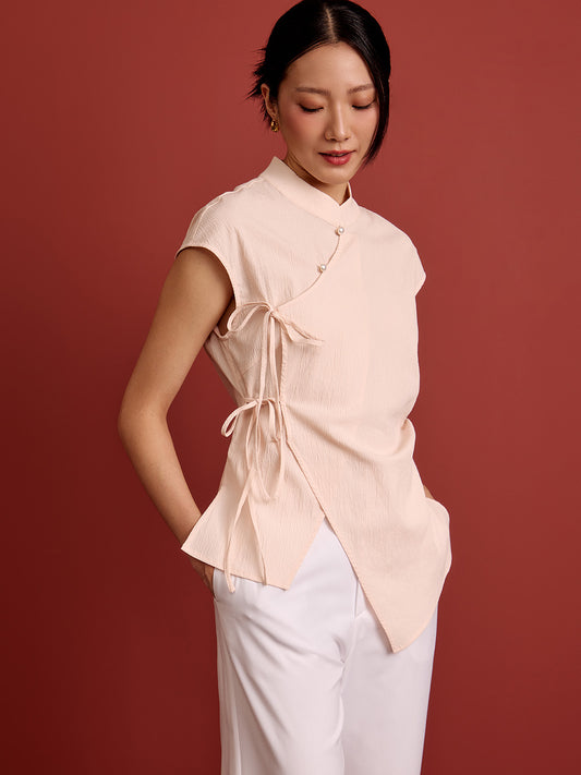 Mandarin Collar Cross Ribbon Top - Pink Seersucker