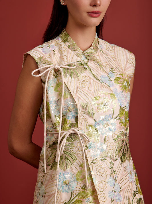 Mandarin Collar Ribbon Vest - Beaded Floral Embroidery