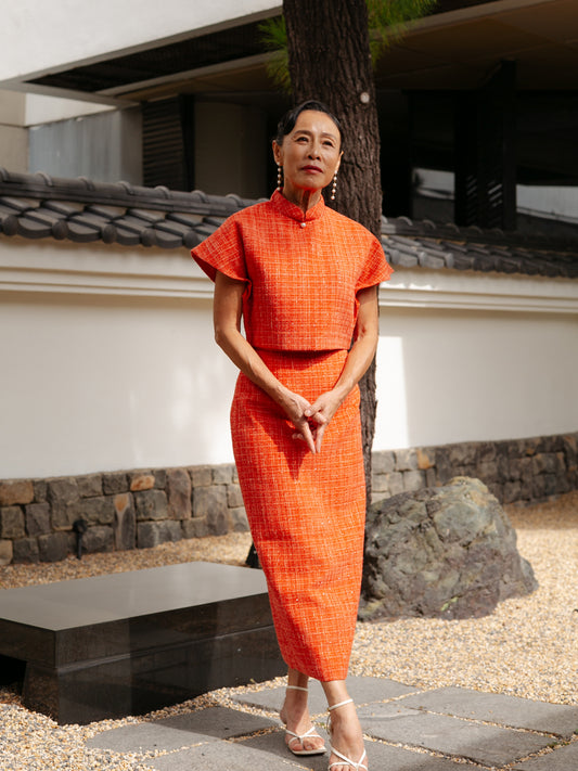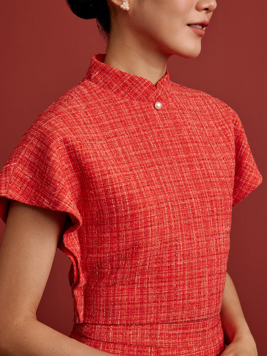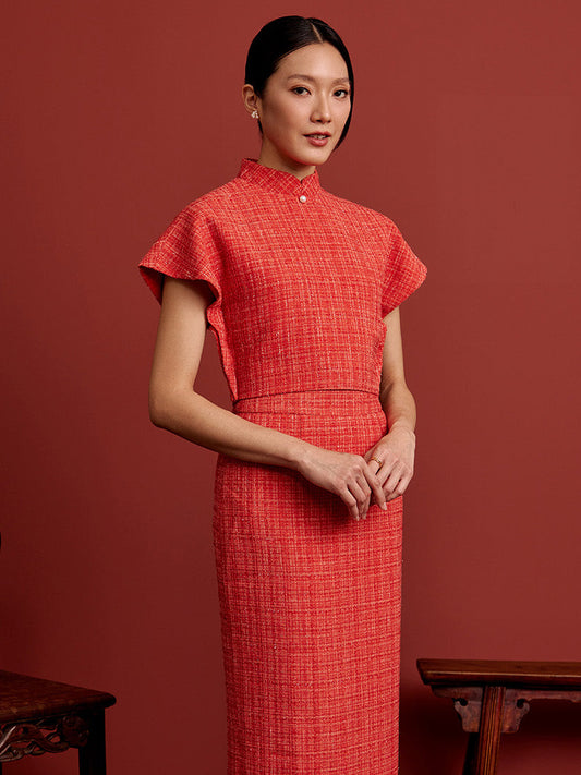 Padded Kaftan Sleeve Cropped Top - Orange Tweed