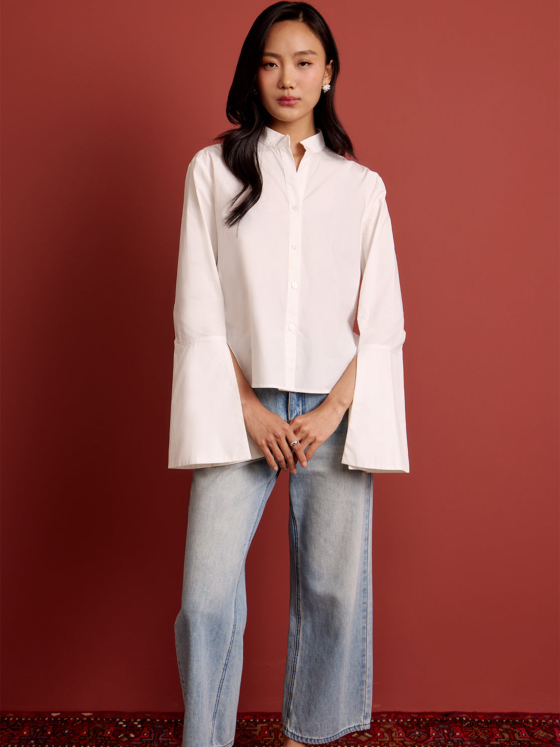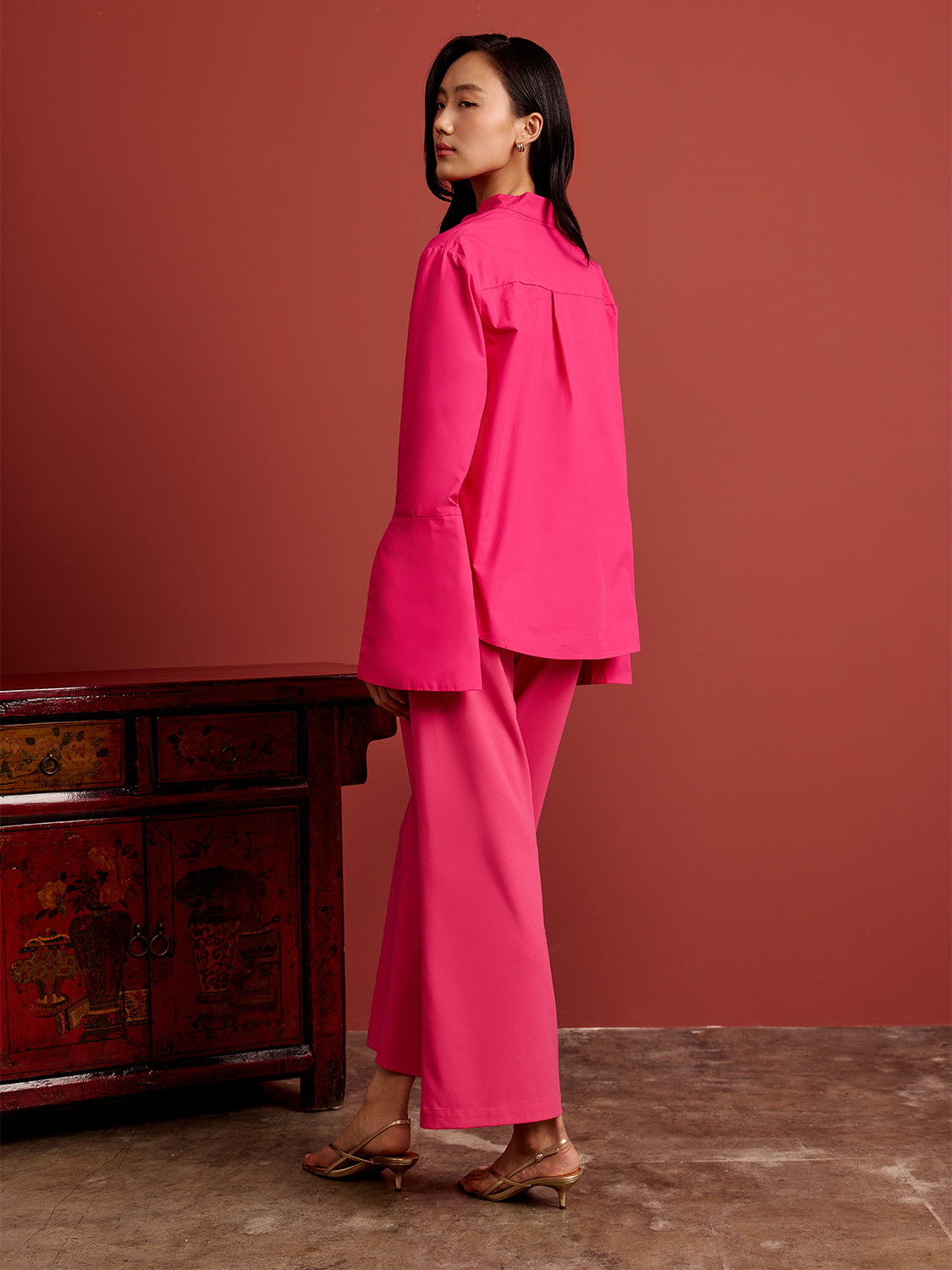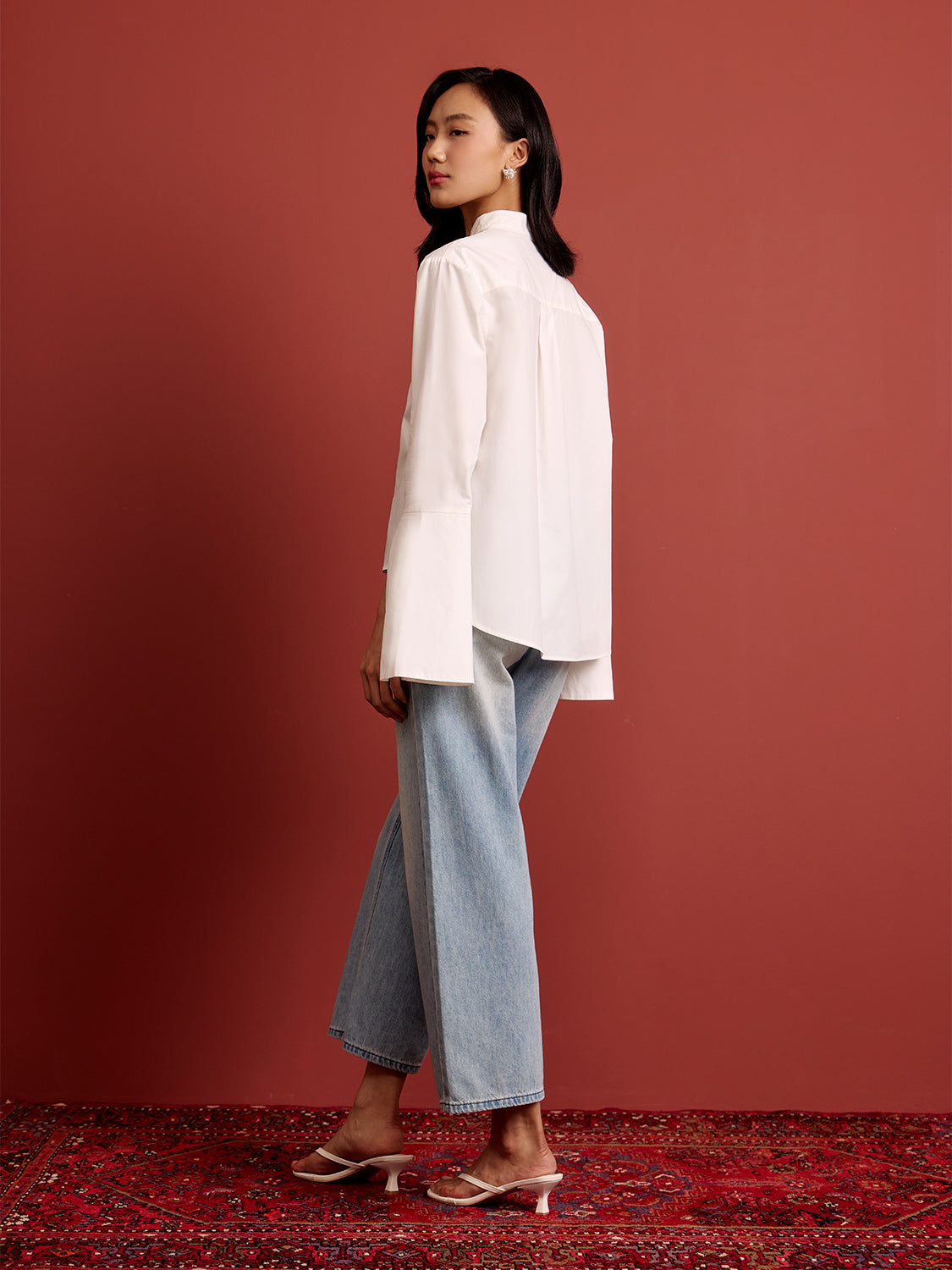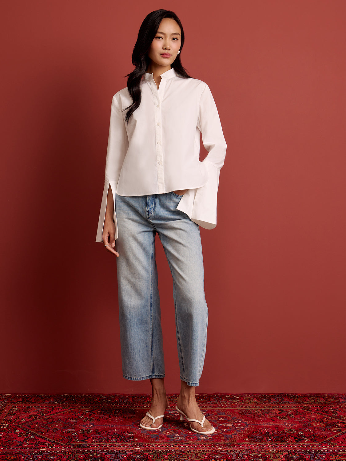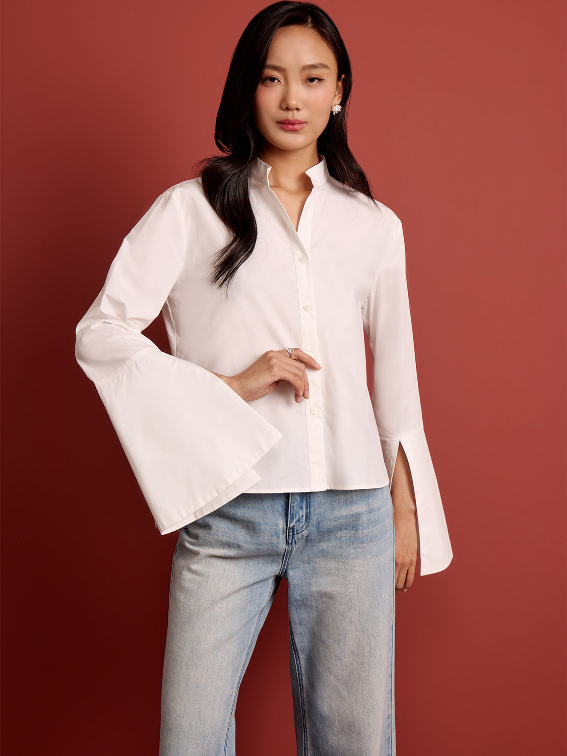 + Mandarin collar with a modern overlapping V-neck lapel