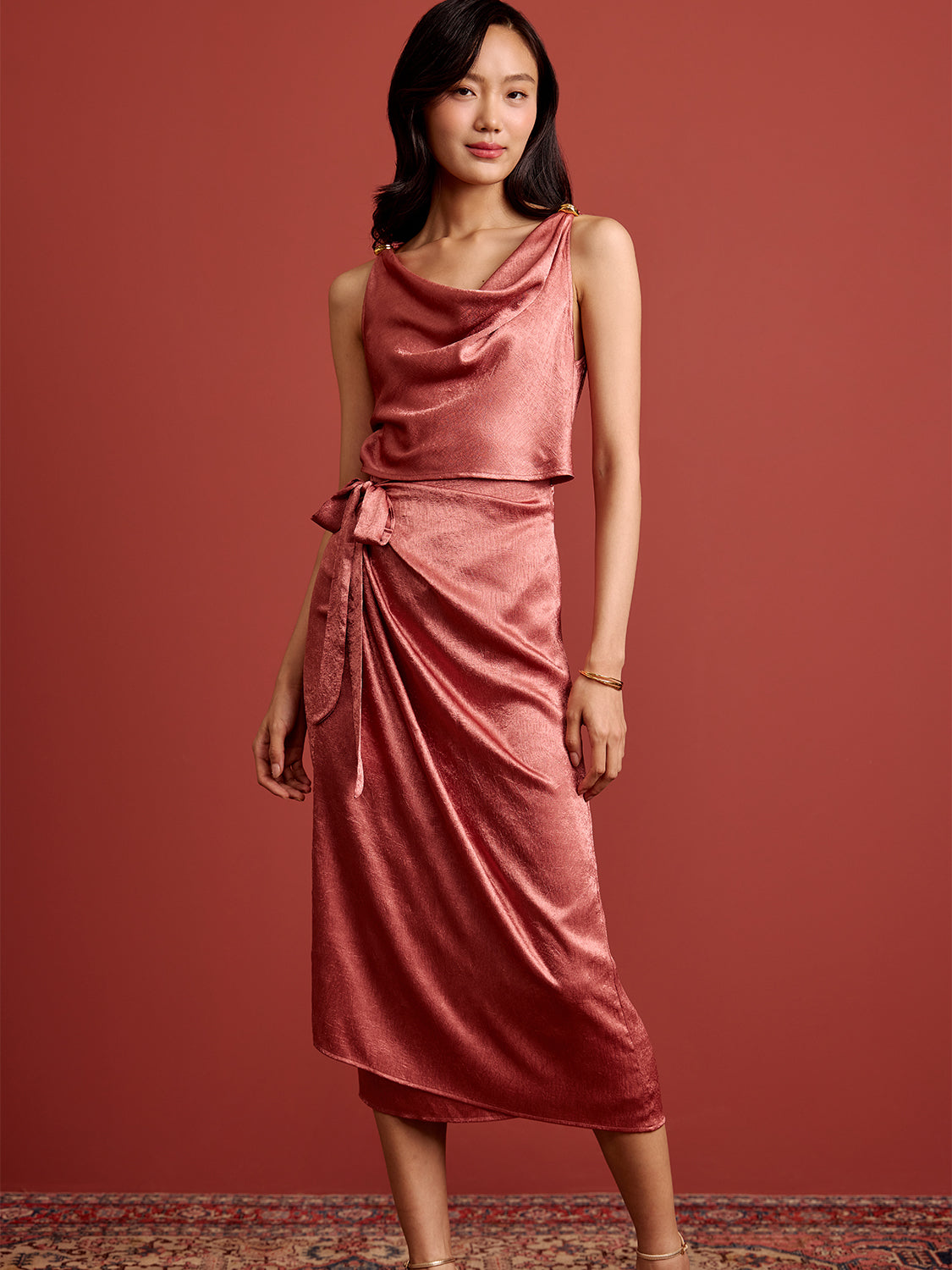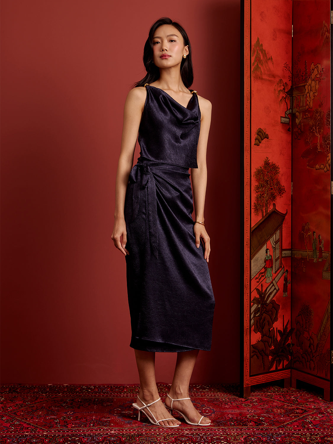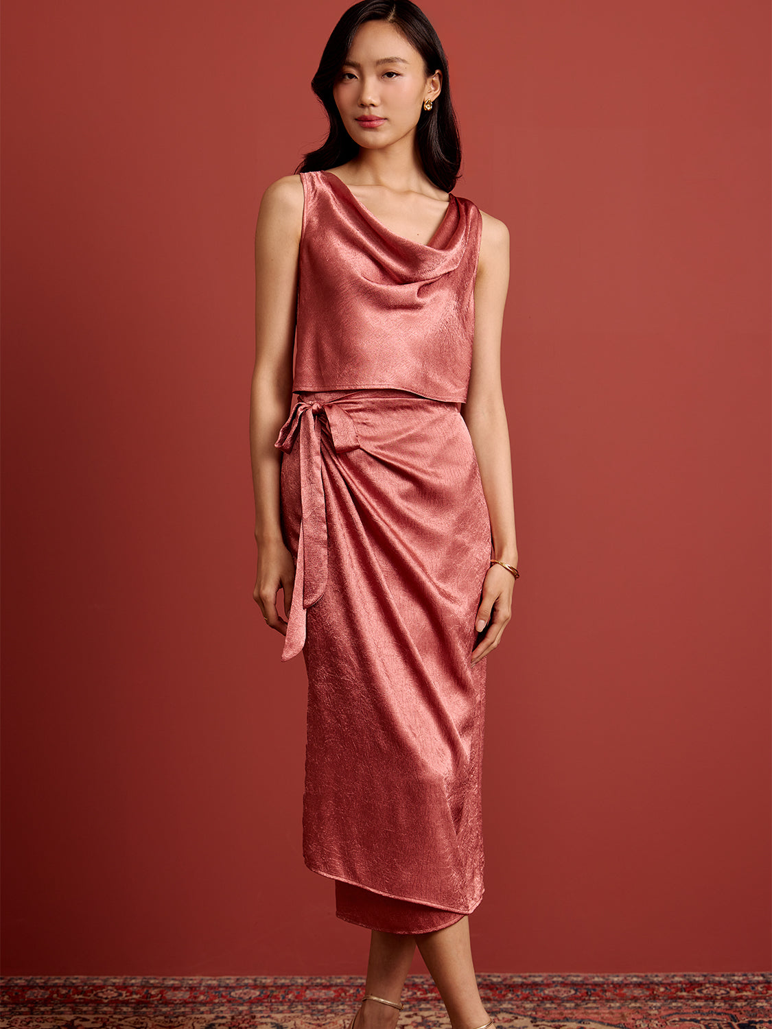 + Crafted in a crinkled satin fabric with a soft, fluid drape