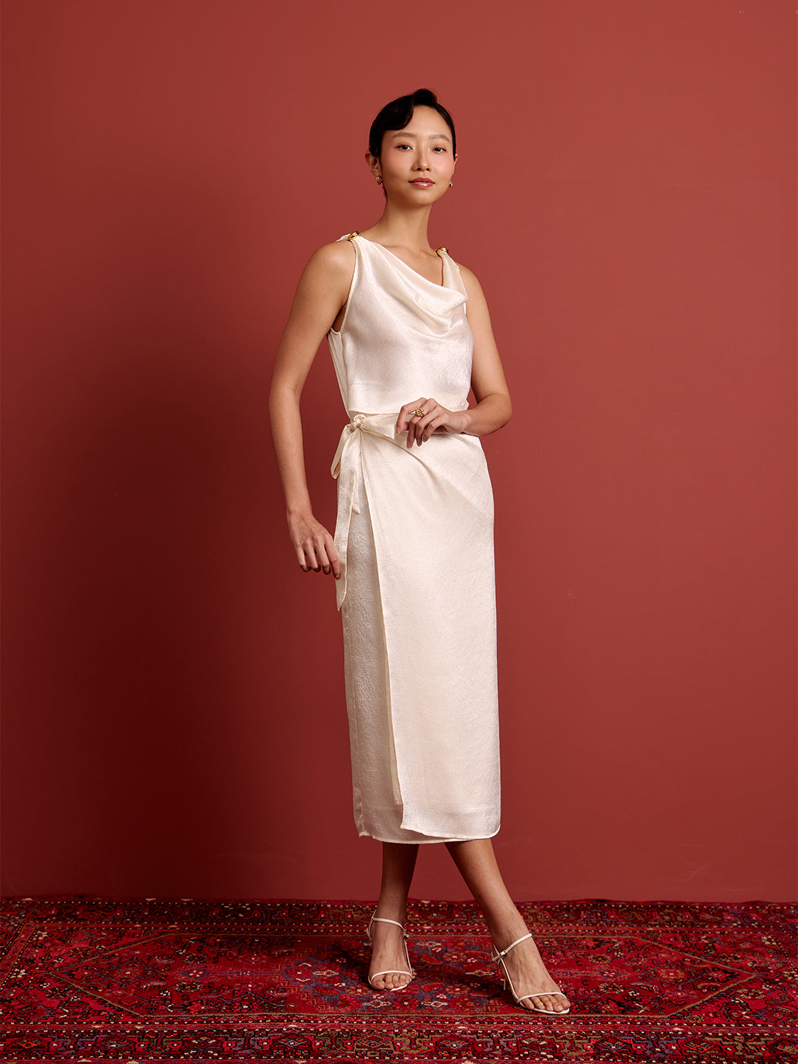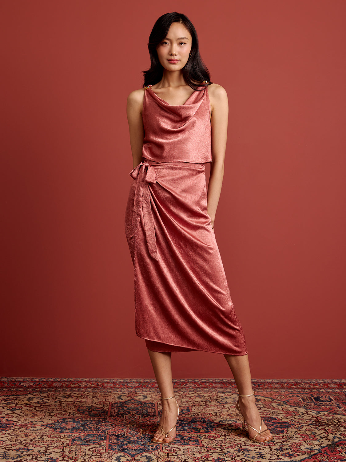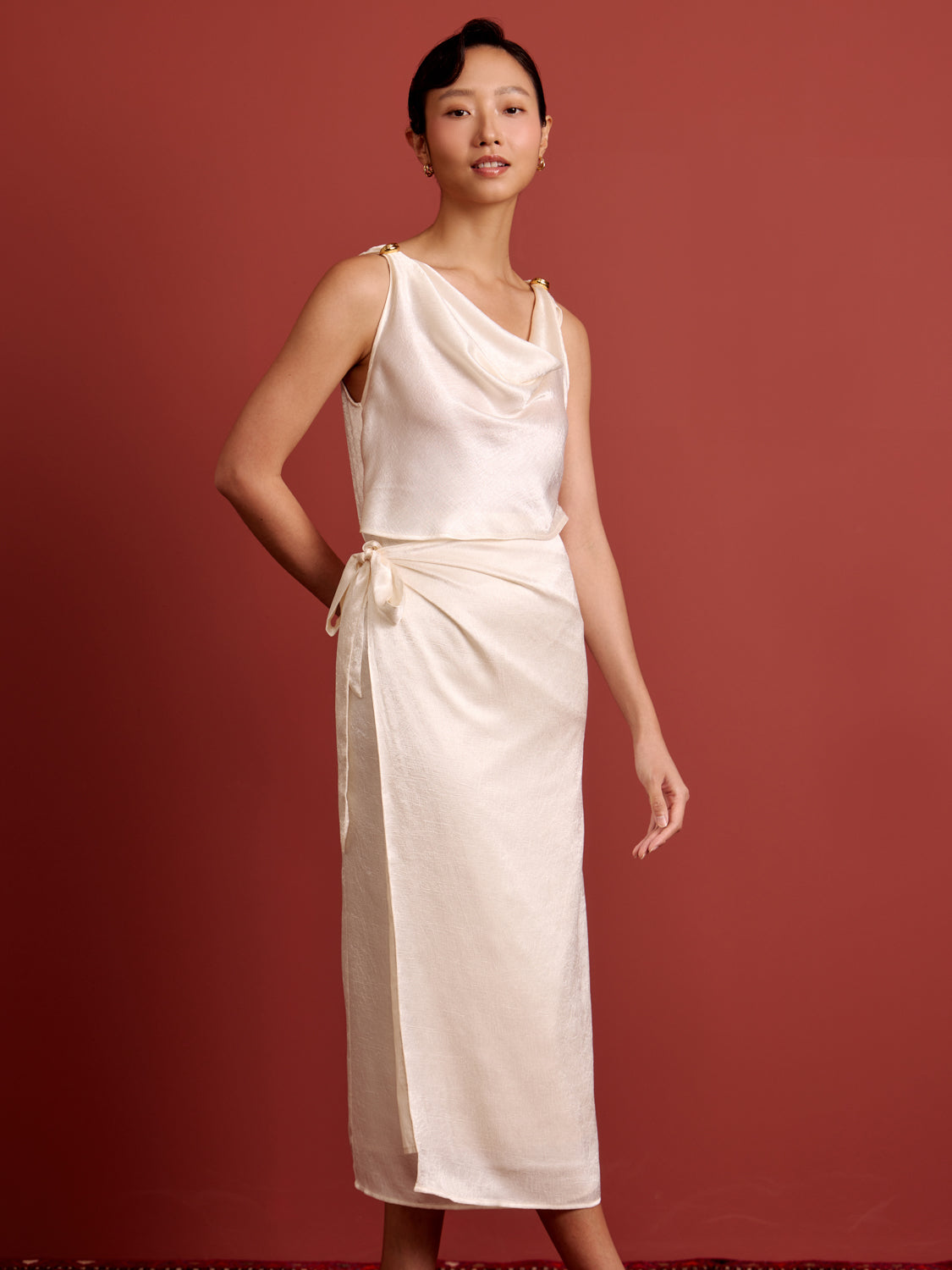 + Crafted in a crinkled satin fabric with a soft, fluid drape