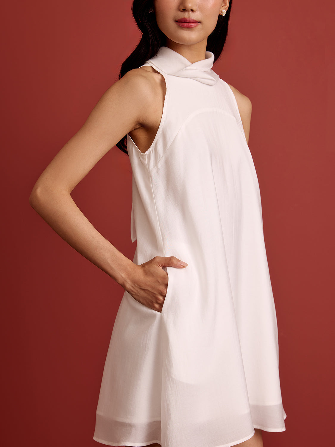 + High-neck drape with an adjustable back ribbon tie
