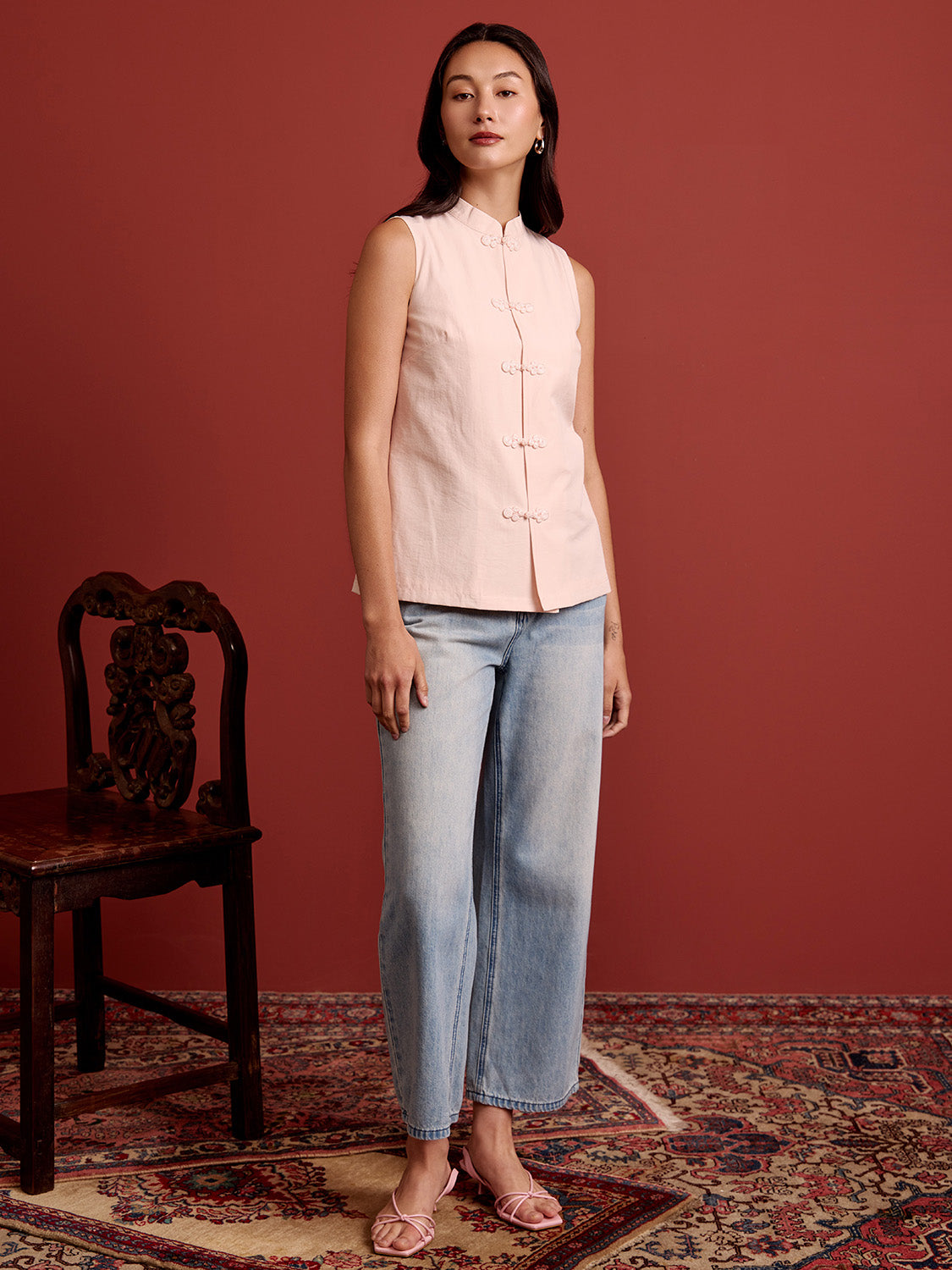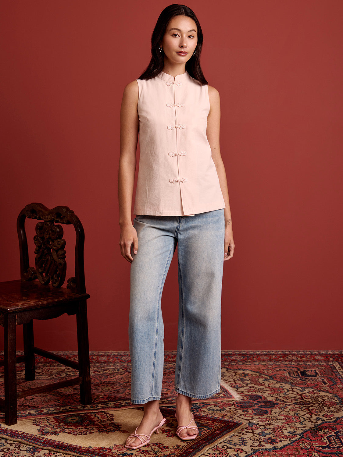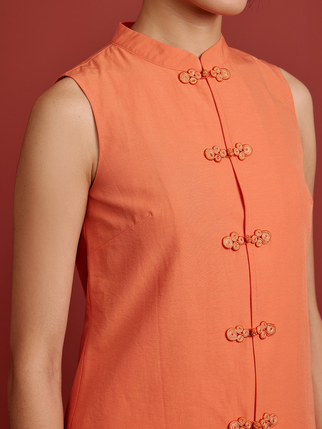 + Mandarin collar neckline with frog button detailing